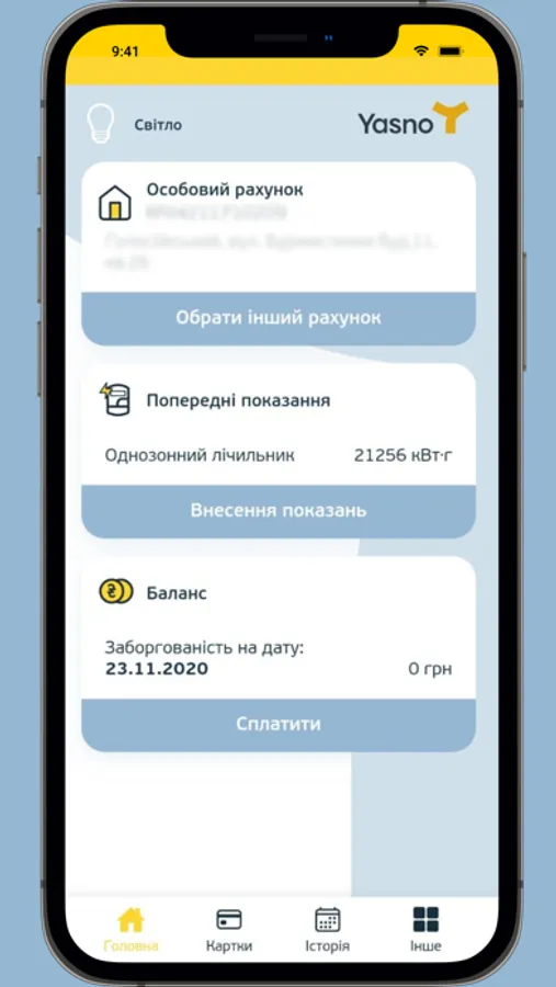 Мобільна версія показує інформацію особового рахунку з електроенергії та газу, як і в Особистому кабінеті YASNO.