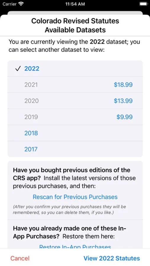 *** Colorado Revised Statutes is now a FREEMIUM app—the app itself is now free, with in-app purchases available to unlock previous years' datasets; discounts are applied to the price of each dataset depending on how old the dataset is as well as how many datasets you have previously purchased. ***