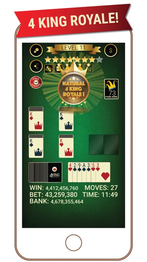 4 King Royale® is a fun and addicting new card game that you can play as solitaire or as a multiplayer game against others. The clean and crisp design of the cards and screen layout make playing this new game hugely entertaining. If you enjoy blackjack and the many various forms of solitaire and patience card games it's quite likely you will love this game.