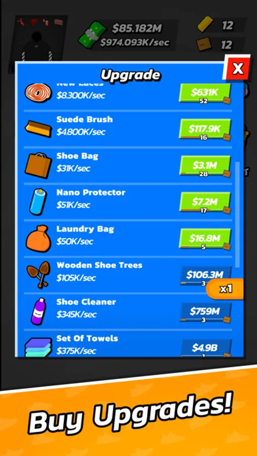 There are two categories of upgrades – Addons and Upgrades. Addons section includes various different items that automatically generate money such as New Laces or Shoe Brush. Cost of these buildings increases incrementally. The upgrades section contains upgrades to improve your clicking rate and the amount of money you generate per click. This game is progressive and in no time at all you will be earning enough money to finally afford all JS23 or Lebrons you've dreamed of and your popularity will grow. Sneakers Clicker is a must have if you are a hypebeast.