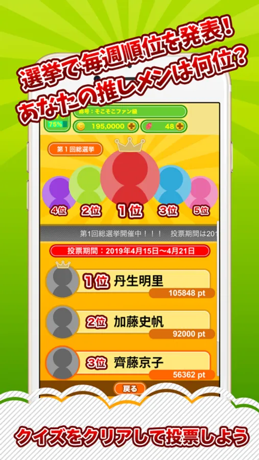 全国のファンとクイズで対戦!総選挙で推しメンをランキング1位に押し上げろ!