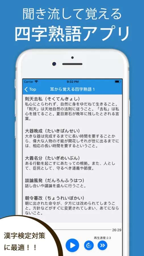 日本語の勉強や、漢字検定対策の補助教材として便利です。問題集などで「書く」だけではなく、音声で「聞く」ことによって、より一層四字熟語を自分のものにできます。