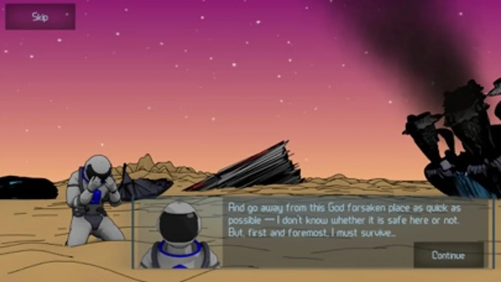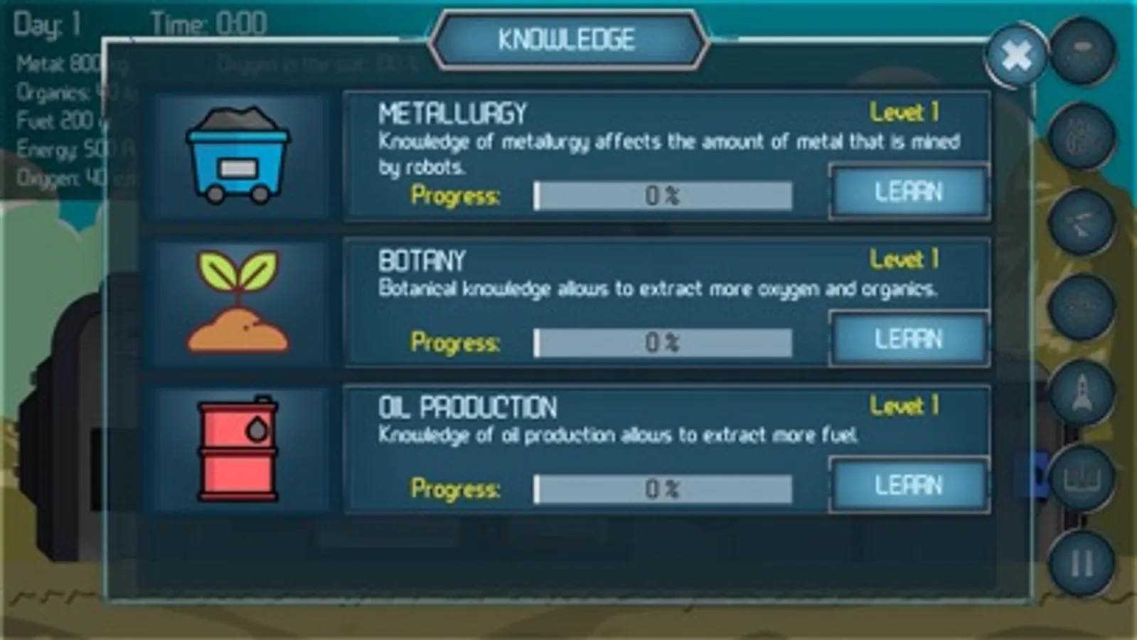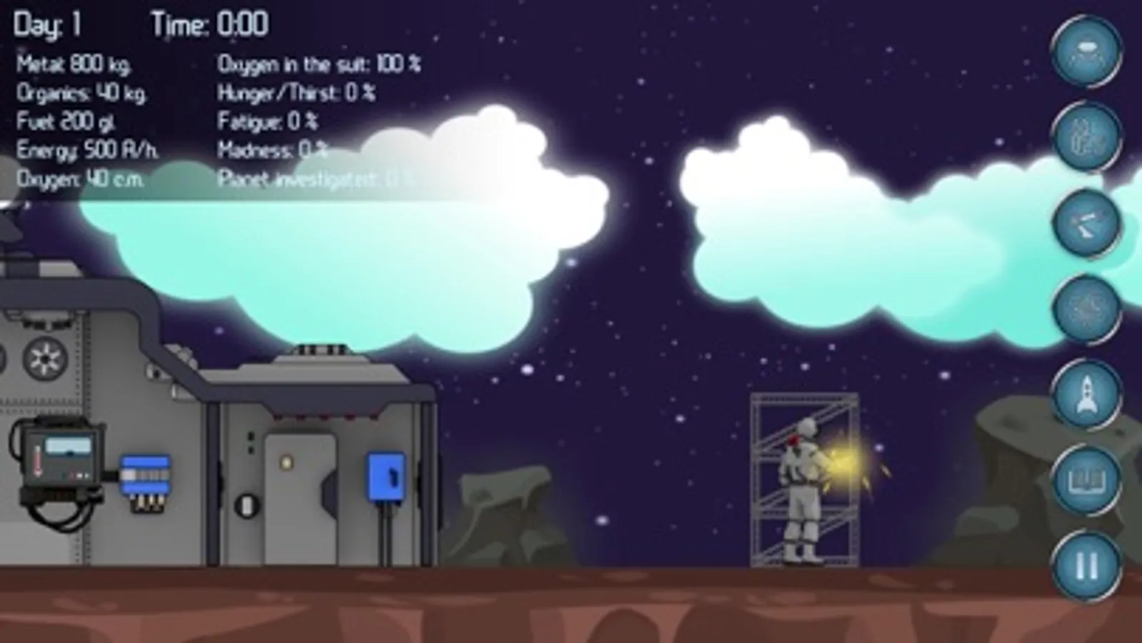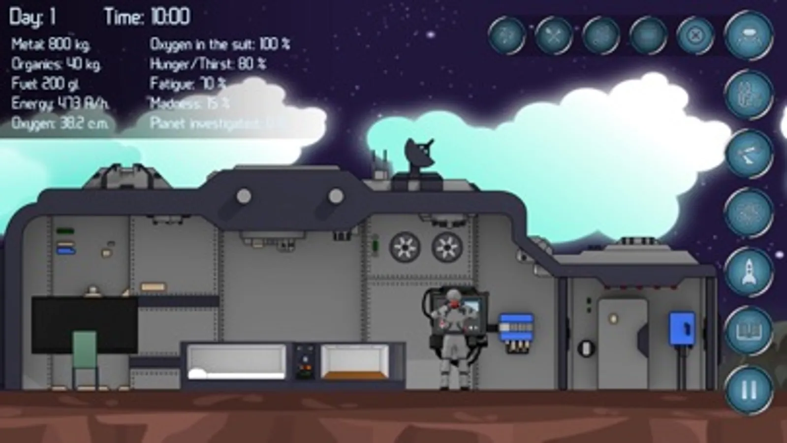 You suffered a wreck in an unknown system due to spacecraft failure. Everything you have is an emergency accommodation module and a heap of scrap. But by good fortune, you are an engineer and you have a clever pair of hands. Upgrade your habitation, build assisting robots, collect enough resources and build a spacecraft. To come home, you will have to visit all planets to determine your current location. In addition, you need to breathe, sleep and eat – remember about it!