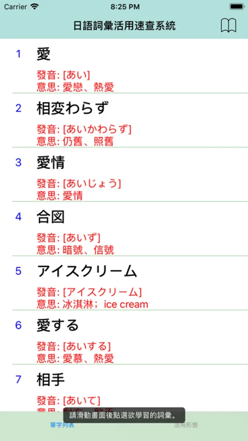 1.本系統內建3000多個日語詞彙,提供發音與中文字義參考。
