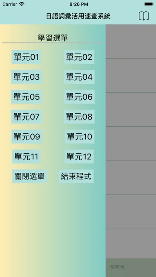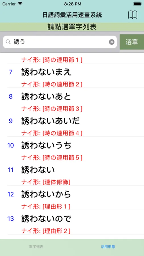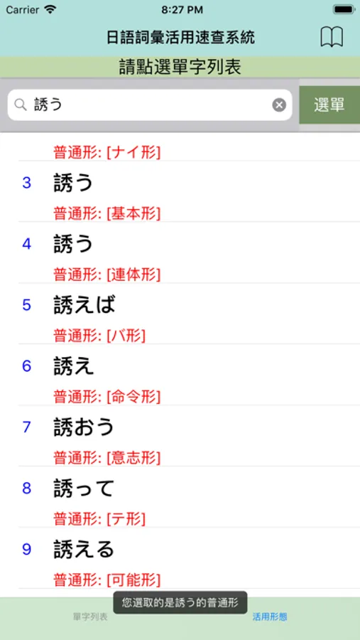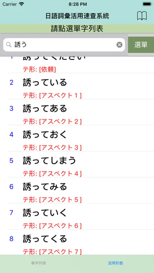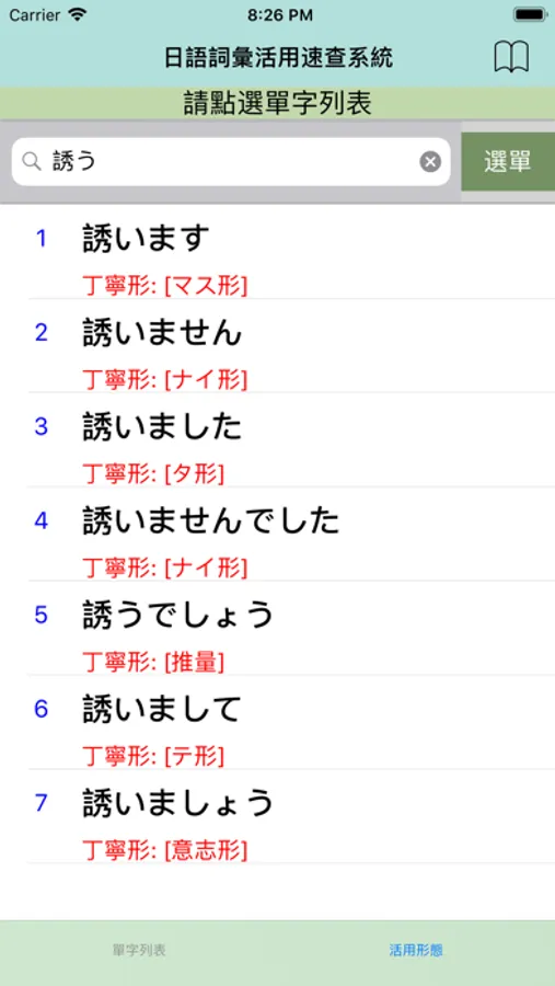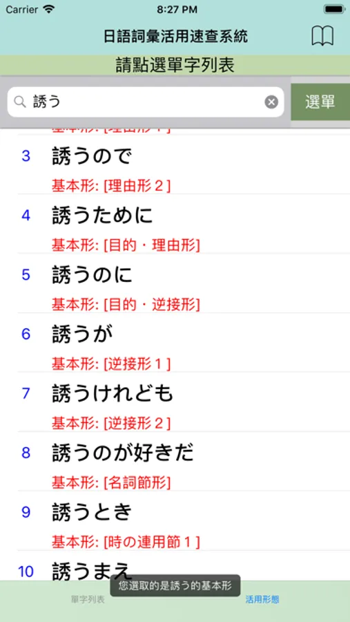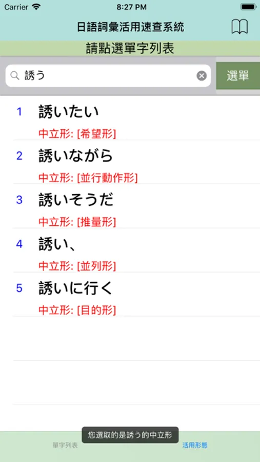 2.點選任一單字立即產生該詞彙的特定接續型態。