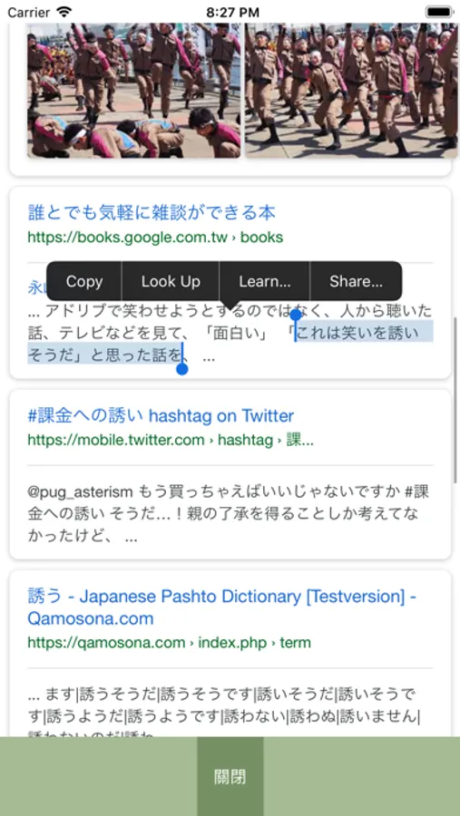 4.點選任何一個項目,系統則同時與語音合成連動,念出被點選的項目,同時開啟網頁連結,顯示該句型在網頁檢索中使用使用的情況,做為進一步學習參考。