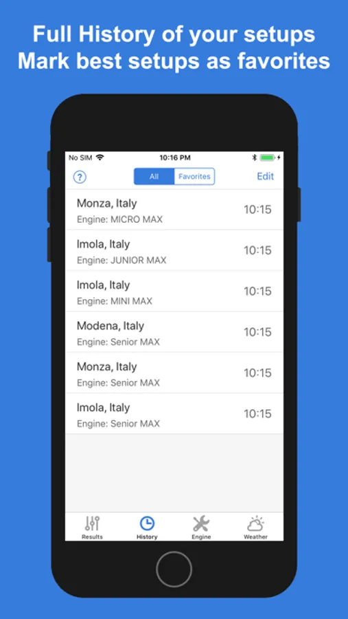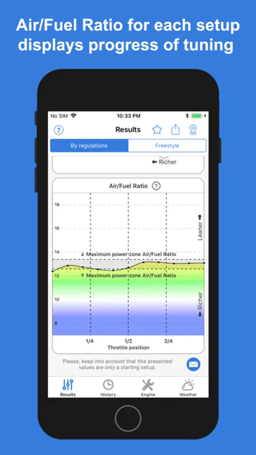 • History: This tab contains the history of all jetting setups. If you change the weather, or engine setup, or fine tuning, the new setup will be saved in history.