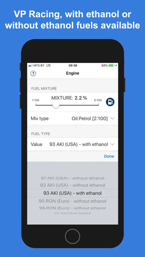 • Selectable fuel type (VP MS93, gasoline with or without ethanol)