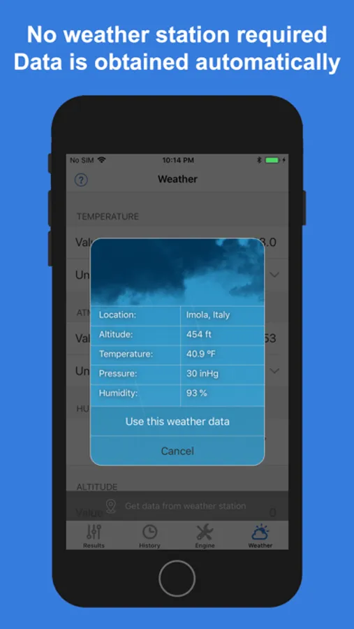 This app can obtain automatically the position and altitude to get the temperature, pressure and humidity from the nearest weather station thought internet. Internal barometer is used on supported devices for better precision. Application can run without GPS, WiFi and internet, in this case user has to enter weather data manually.