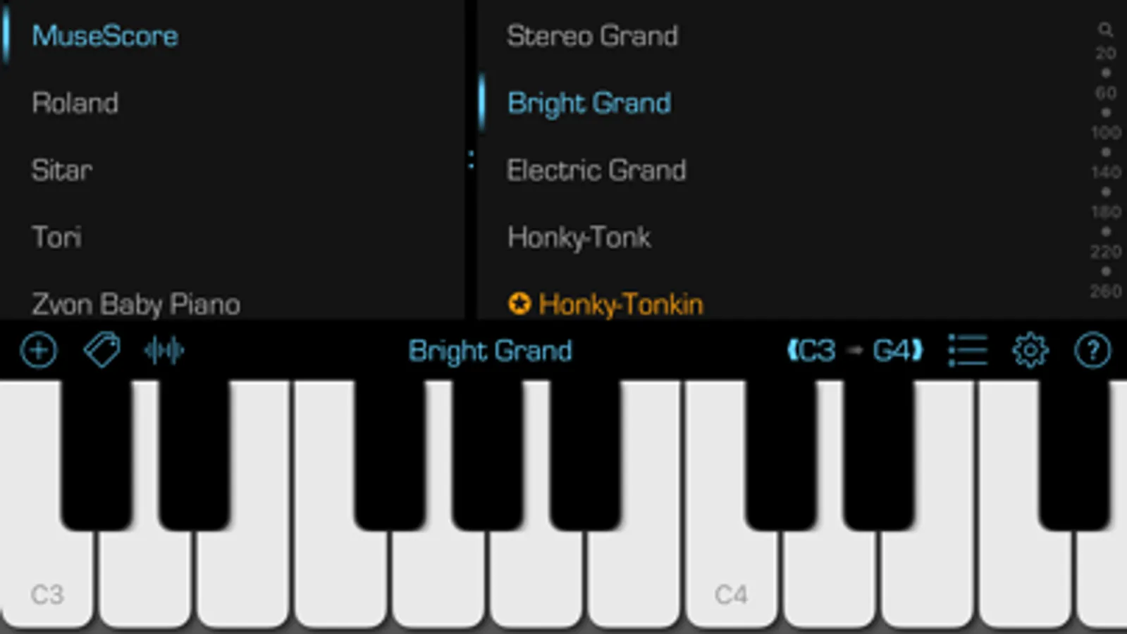 The app supports MIDI input -- just connect a MIDI keyboard/controller to your iOS device and you should be good to go! There is also support for MIDI over Bluetooth. You can also control some app settings using MIDI controls, including the active favorite preset and the audio effects.