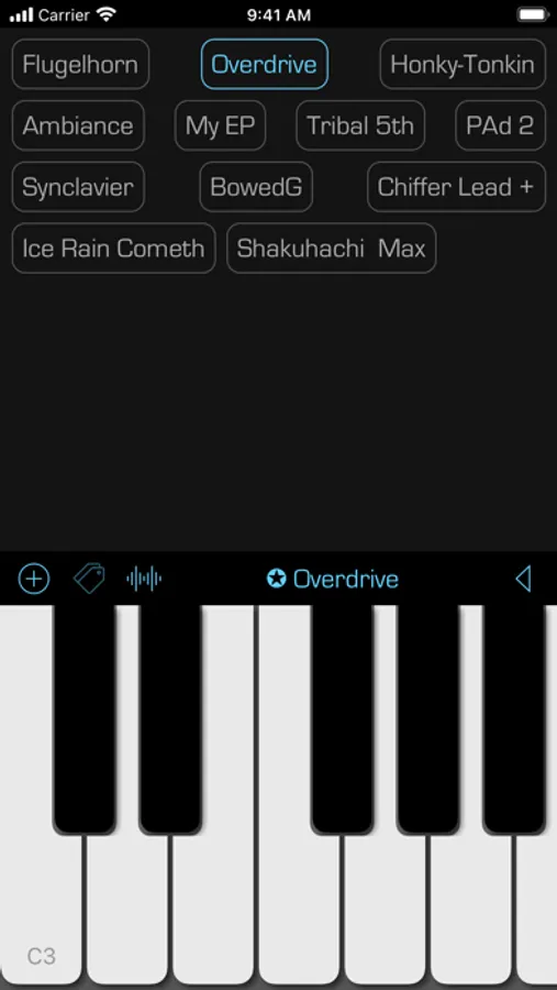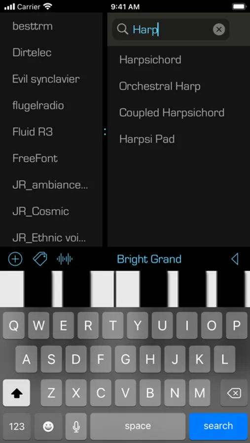 This is a straightforward yet powerful app that acts as a polyphonic audio synthesizer with a virtually unlimited collection of sounds. Under the hood, It uses an AVAudioUnitSampler to generate the audio output when you touch one or more keys. The sounds that are available come from soundfont (SF2) files, such as those available online for free (and of variable quality).