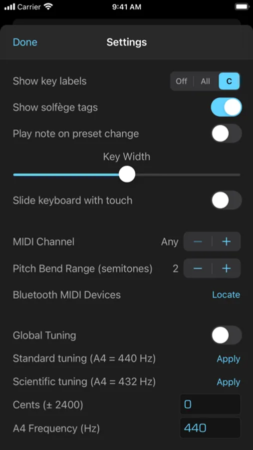 • Touch the labels at either end of the black bar to change the range of the keyboard. You can go as low as "C0" and as high as "C9". You can also change the range by swiping left/right on the black bar. Note that this ability does not exist in the AUv3 extension -- use the native application keyboard controls to achieve the same results. You can also toggle the keyboard sliding feature by touching the small arrow between the note labels.