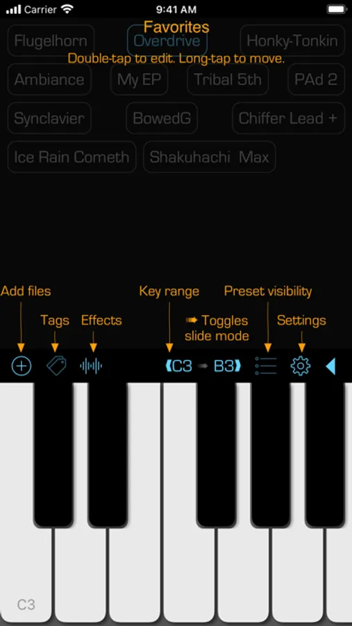 • Switch between the soundfont patches listing and the favorites view by double-tapping on the patch name in the black bar above the keyboard. You can also swipe left/right with two fingers in the patches and favorites views to switch to the other view.