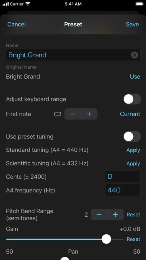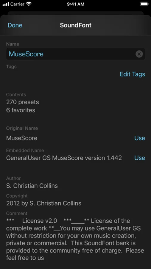 • Add a SoundFont (SF2) file that you have downloaded onto your iCloud Drive. Press the "+" button and then locate the file to add. You can always change the display name of the SoundFont by swiping right. And you can remove a SoundFont that you no longer want by swiping left on its name.