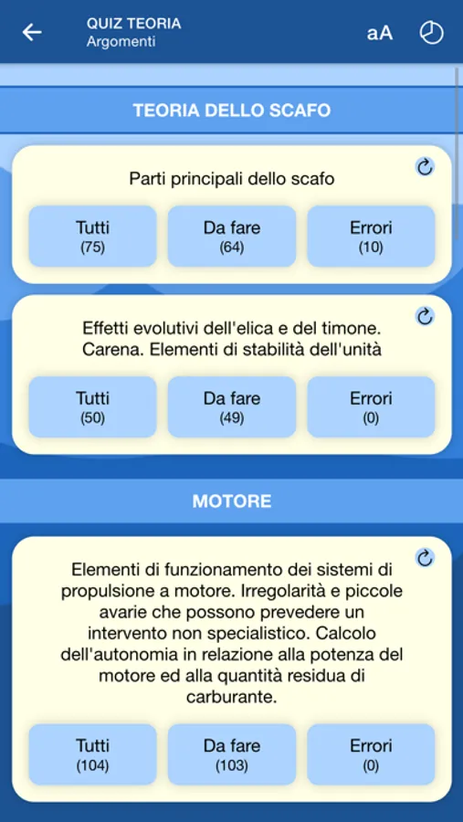 - statistiche memorizzate, per fare solo i quiz sbagliati o solo quelli ancora da fare