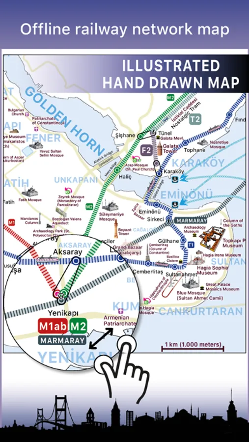 3- A realistic, offline and hand-drawn railway network map of Istanbul that indicates historical and touristic places.