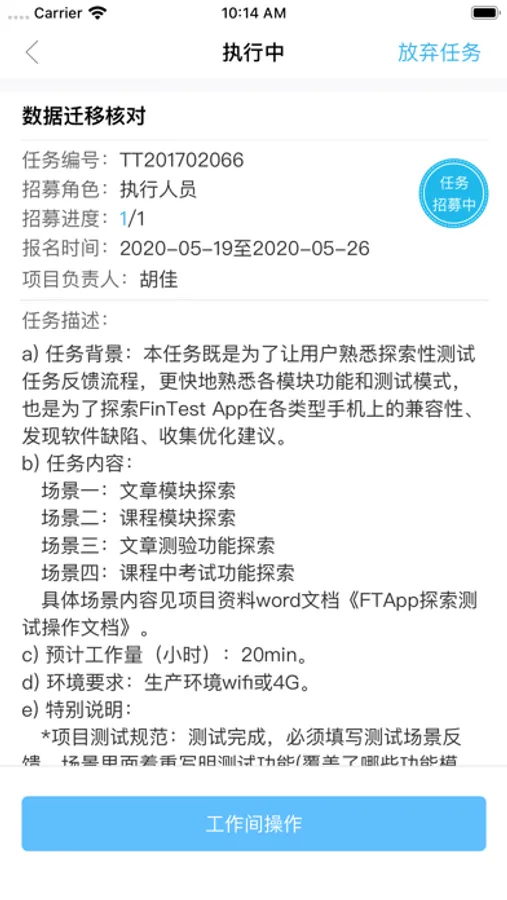 【工作间】查看任务资料,执行测试任务,提交测试结果;