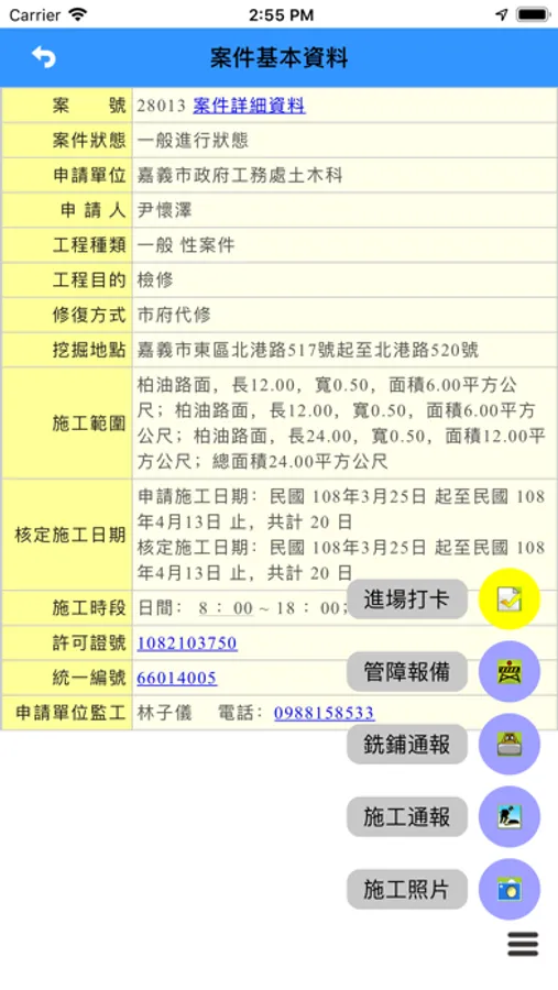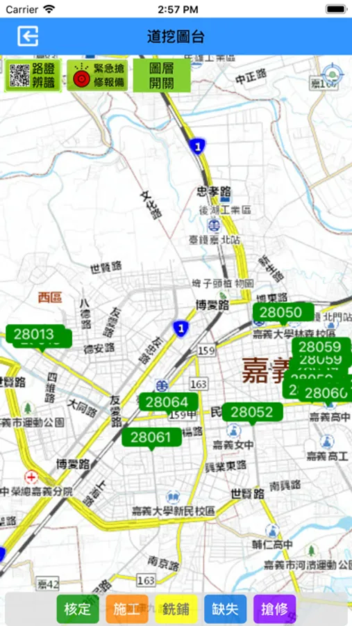 本市道路挖掘現地查報App提供嘉義市各公、私立機關之道路施工人員可即時於市區公共道路施工現場,由使用者自主上傳行動裝置GPS坐標資訊,進行施工現況通報、施工進退場打卡、現場照片上傳至本府道路挖掘管理系統,並將現地施工資訊公開於本府道路挖掘便民服務系統,以利民眾即時查詢、追蹤市區公共道路施工狀況,共同監督公共工程施工品質、提升交通安全。