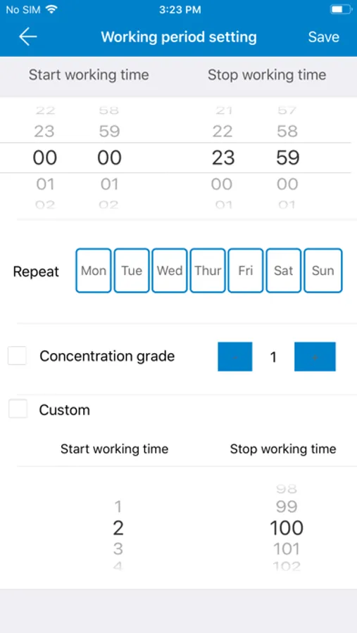 -Bluetooth contriving, including working hours,days in week,Concentration grade