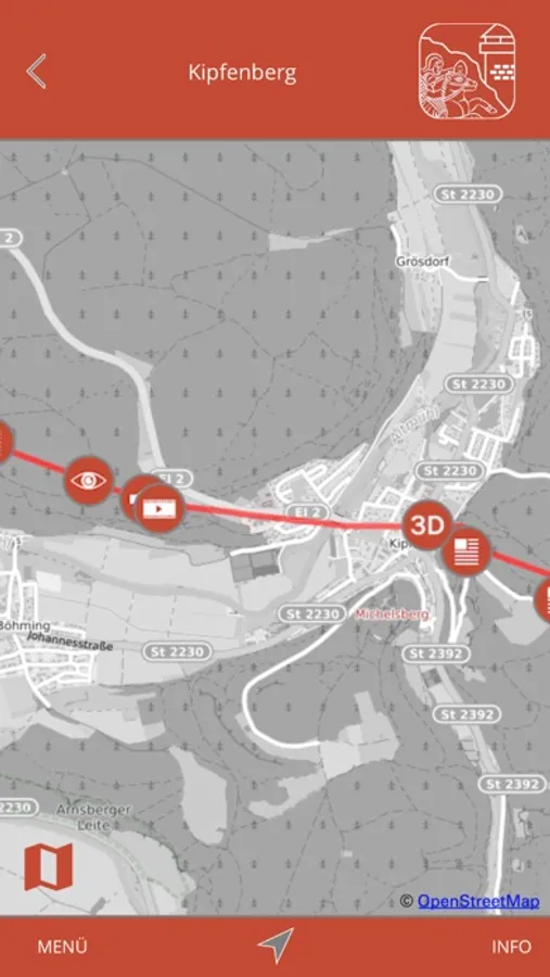 The zoomable OSM map data (© OpenStreetMap) provides easy access to the content. Both maps and content are available offline (internet connection is not mandatory). Clickable Points Of Interest on the maps start the content on request. 3D models, AR features, 360 views, video and audio sequences as well as text-/picture information are provided. An integrated GPS navigation with an alert guides you to the sites. An alternative list view shows you the available content.
