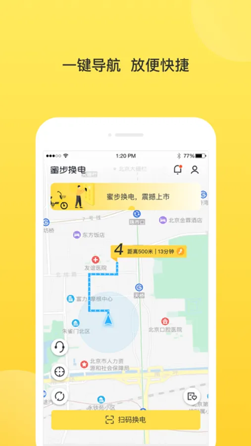 【便捷的换电方式】通过地图一目了然查看附近的换电站,点击换电站一键导航轻松到达。