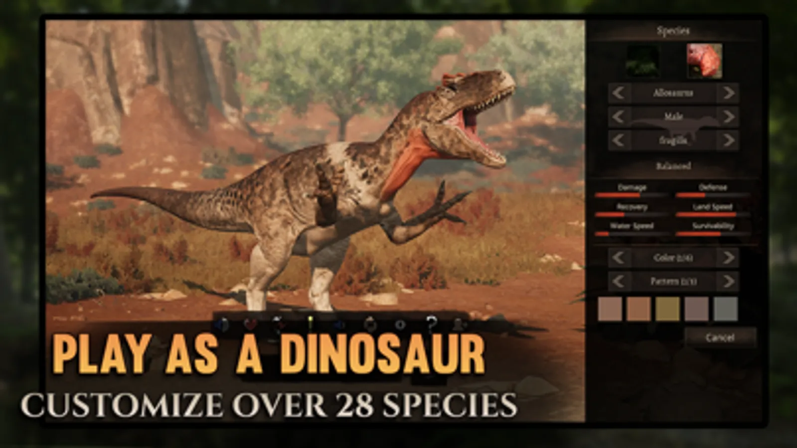 Unlock skins and change colors and markings of your dinosaur. You can choose brighter colors to stand out from your pack or use camouflage to blend in with your surroundings. Complete quests to unlock new combat abilities like bone breaking tail slam, bleeding claws, and venom bite! Create a character unique to you!