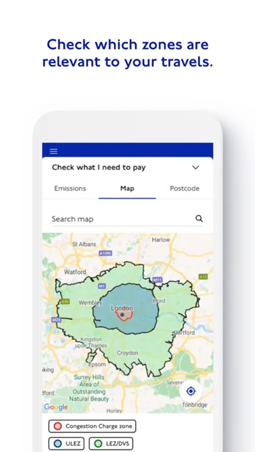 - View map of zones and check if a postcode is in a charging area
