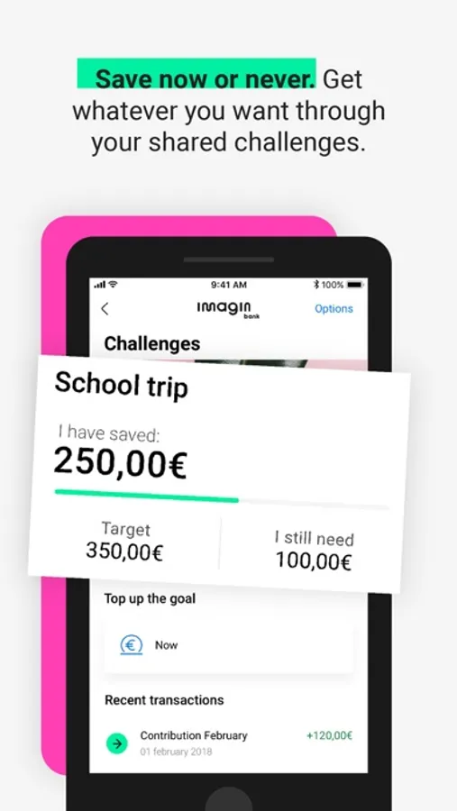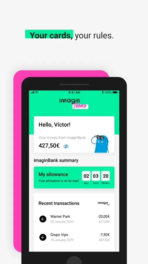 imaginTeens is a finance app with which you will be able to start to control your money from your phone, receive your pocket money, ask for money to your dad or mum, have your own credit card to buy when and where you want. It will also help you to save bit by bit to achieve your goals.