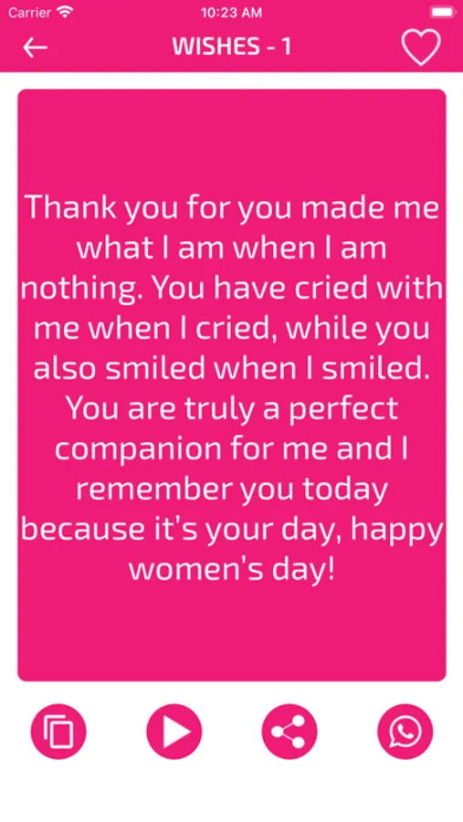 Happy Women's Day Wishes app have a collections of greetings and wishes. App allows you to send Women’s day wishes and greeting to all the wonderful / beautiful women’s in the world. You can sent amazing wishes to your friends, family, and everyone you love.