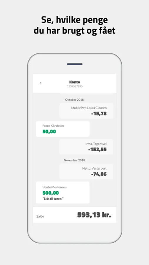 MinePenge giver dig overblik og, hvor mange penge, står der på kontoen. App'en giver kun adgang til at se, hvad der står på kontoen. Men, der kan ikke overføres mellem konti.