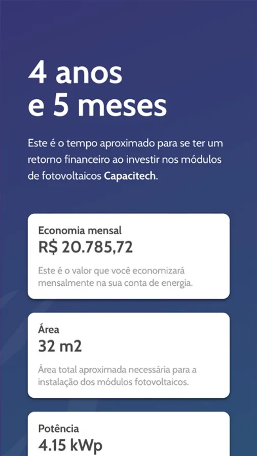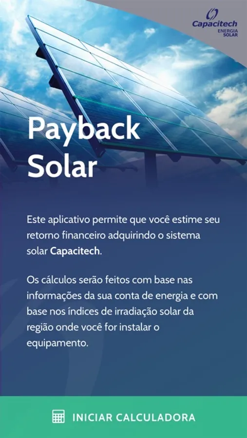 O aplicativo da Capacitech foi planejado para calcular o custo-benefício e investimento com o sistema fotovoltaico, fonte renovável de energia que gera pontos positivos para a sua economia.