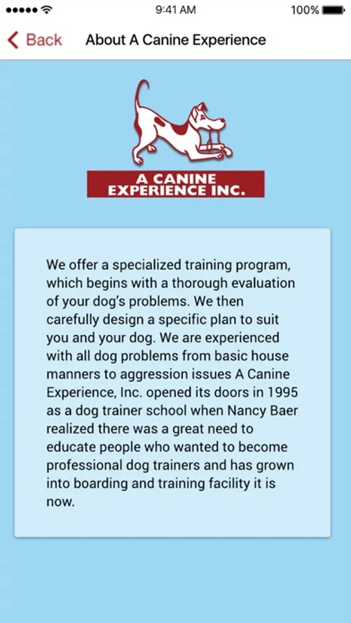 A Canine Experience, Inc. opened its doors in 1995 as a dog trainer school when Nancy Baer realized there was a great need to educate people who wanted to become professional dog trainers and has grown into boarding and training facility it is now.