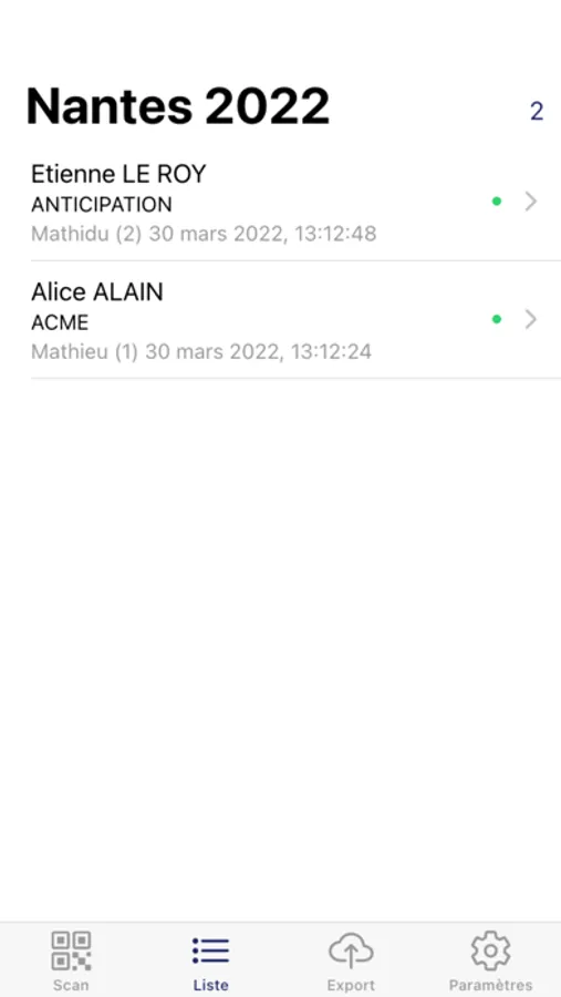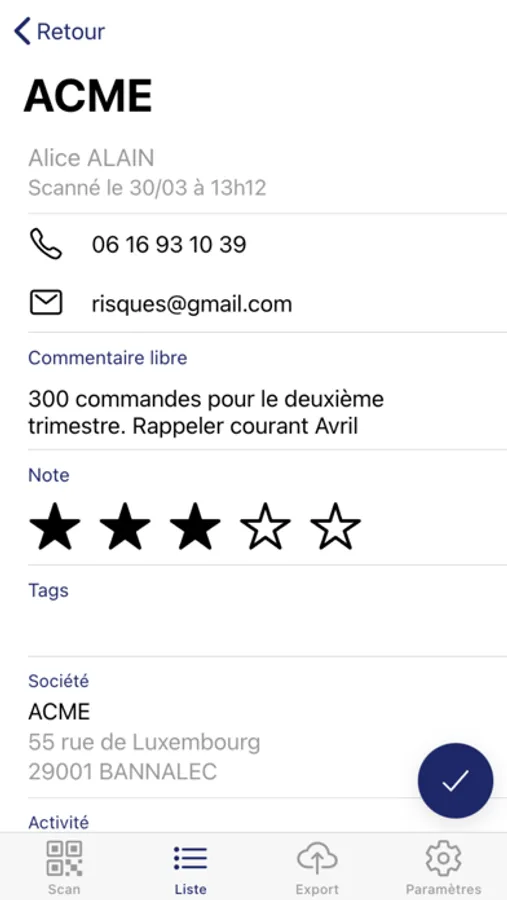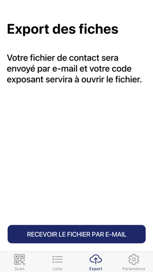 Une fonction d'export par e-mail permet aux utilisateurs de recevoir un fichier contenant l'ensemble des métadonnées associées aux fiches visiteurs scannées pendant le salon.