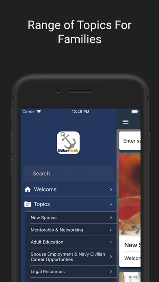 The MyNavy Family mobile application connects Navy spouses and families to information and resources to help them successfully navigate the complexities of life in a Navy family. It combines authoritative information from a wide range of websites into a single, convenient application. New resources and links continue to be added, like those for the COVID-19 pandemic.