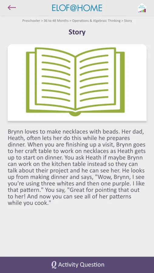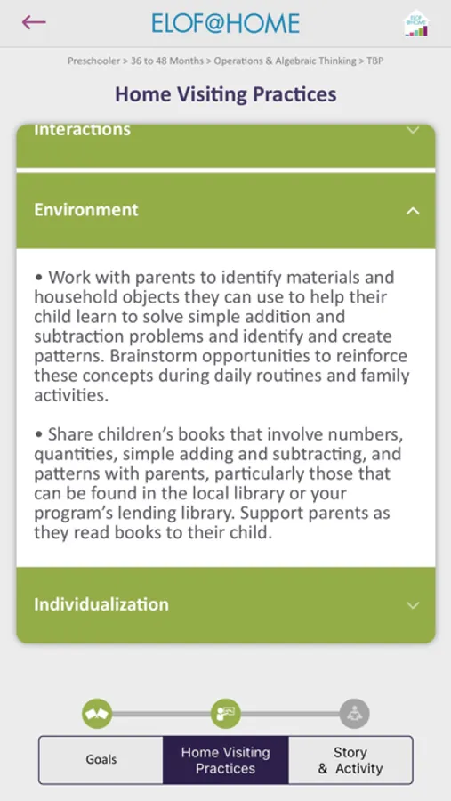 The ELOF@Home is a mobile solution for home visitors who want to access, and learn more about, the Head Start Early Learning Outcomes Framework (HS ELOF). The app provides on-the-go access to the ELOF goals for children and effective practices for home visitors in support of those goals.
