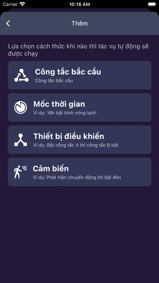 - Bạn có thể tạo các kịch bản để điều các thiết bị trong nhà như: trước khi trở về nhà từ cơ quan, bạn chỉ cần bấm “Về nhà”, bình nóng lạnh sẽ bật, hệ thống quạt thông gió, điều hòa nhiệt độ sẽ khởi động… để khi bạn về đến nhà, tất cả đã sẵn sàng phục vụ.