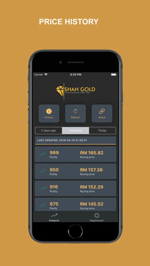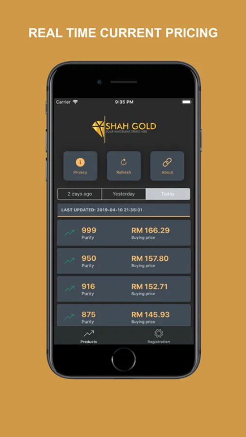 Aplikasi mobile bagi paparan harga di SHAH GOLD. Kami menyediakan servis dan pembelian harga yang terbaik untuk pelanggan kami dan kini anda boleh melihat harga terkini kami dengan hanya di telefon pintar anda.