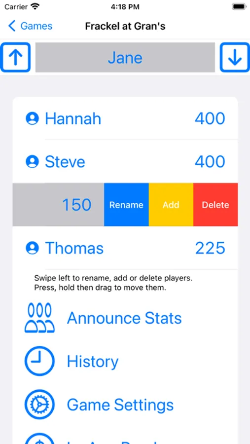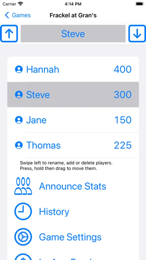 And with the Tally feature, Talking Score Keeper can even be used with games that allow multiple scores in a single turn. These points can either be added to the current player's total or surrendered, depending on the rules of the game. And speaking of points, you can always pull up a history of who scored what on each of the previous turns.
