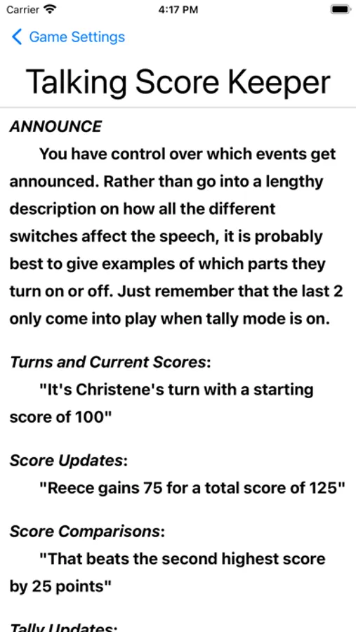 Well, say hello to Talking Score Keeper - or maybe it should say hello to you! It's the only app that announces who's turn it is, their score, how much they need to get to be in first place and much more. It's all customizable in an easy, intuitive interface.