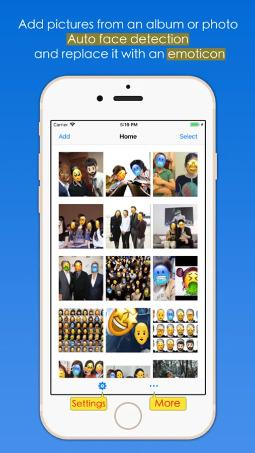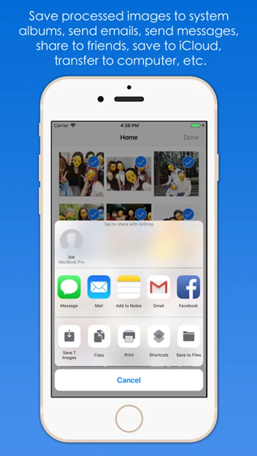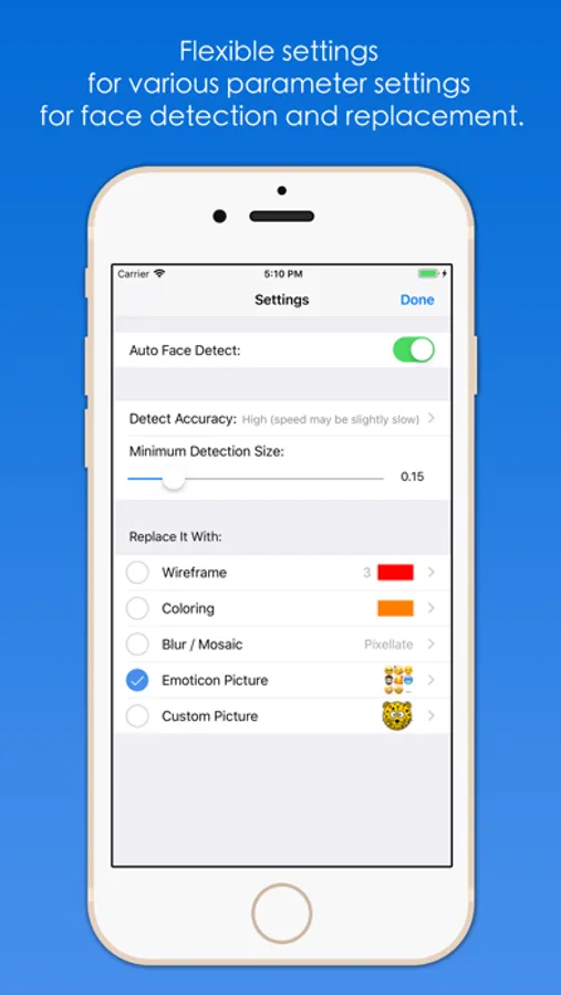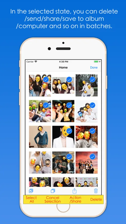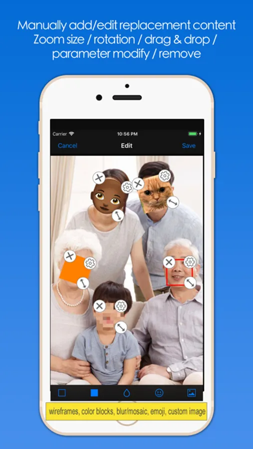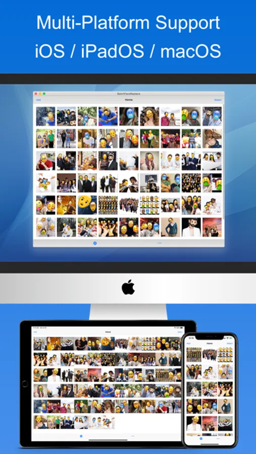 "Batch Face Detect And Replace", the software automatically detects the faces in the image in batches, and then replaces or occludes the face according to the way you specify, such as mosaic blurred faces, emoticons to block faces, or the image you specify obscures the face, and so on. You can also add/edit replacements manually, and you can scale, rotate, drag and drop, parameter adjustments, and removes. The processed pictures can be saved to the system album, send mail, send messages, share to friends, transfer to computer, save to iCloud shared album, print, and so on.