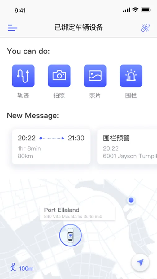 「特色功能」:远程操作记录仪拍照、围栏预警、查看历史行程轨迹。