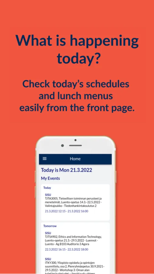 MyJYU has been developed to make students’ lives easier. It includes everything you need in your daily student life: study calendar, University of Jyväskylä’s news and events for students, library card and also IT bulletin. You can find your favourite campus restaurants’ menus, food prices and ingredient lists from MyJYU. To navigate easier on the campus, you can use the built-in campus map. MyJYU also contains job and internship listings aimed at students, as well as list of classes provided by uMove.