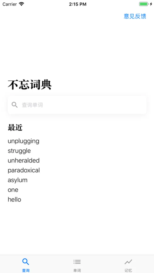 由于讨厌市面上很多词典花里胡哨的设计,所以界面采用了比较有“禅意”的设计,一丝一毫多余的信息都没有,就是查单词、记忆、记忆再记忆。