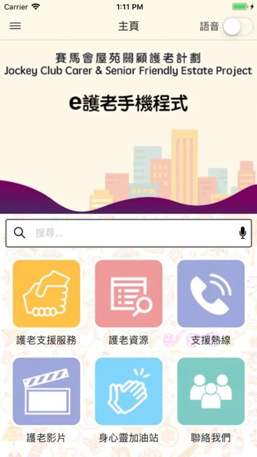 因香港人口老齡化,照顧和護理長者過程漫長、複雜和充滿壓力。由香港賽馬會慈善信託基金捐助的「賽馬會屋苑關顧護老計劃」因此設計e護老App,