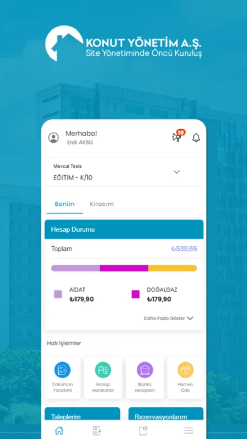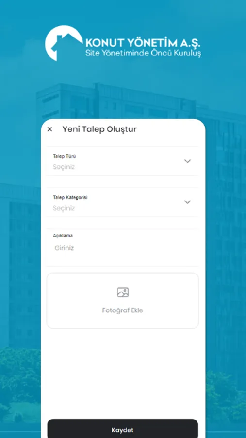 • Taleplerim; Teknik, Güvenlik, Temizlik, Concierge, Bahçe Bakım vb. hizmetler için uygunsuzluğun fotoğrafını çekerek iş talebi açabilirsiniz.