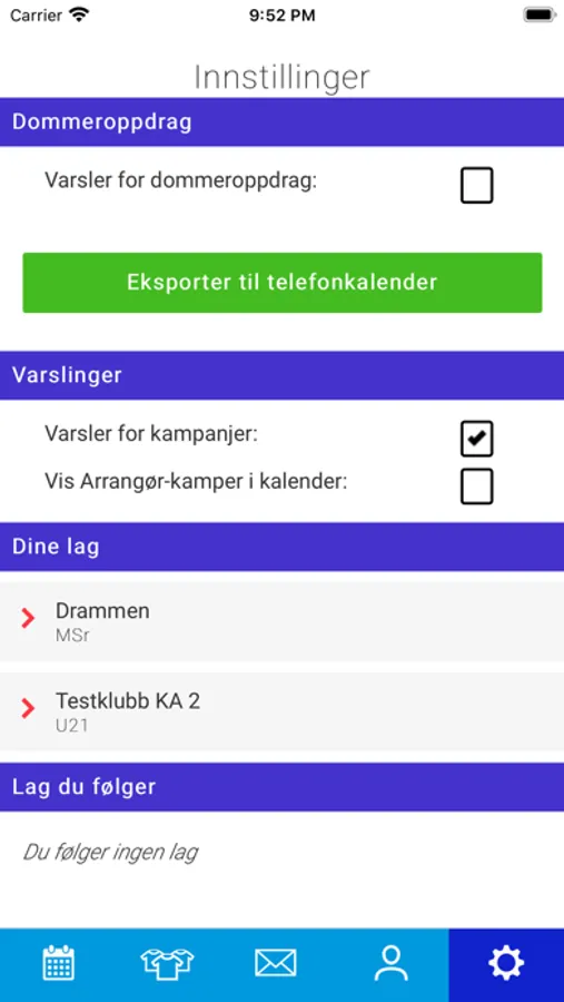 • Mulighet å kunne synkronisere kamper en har i app'ens kalender med telefonkalender