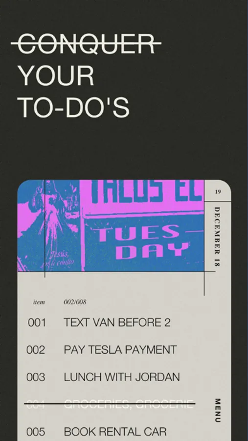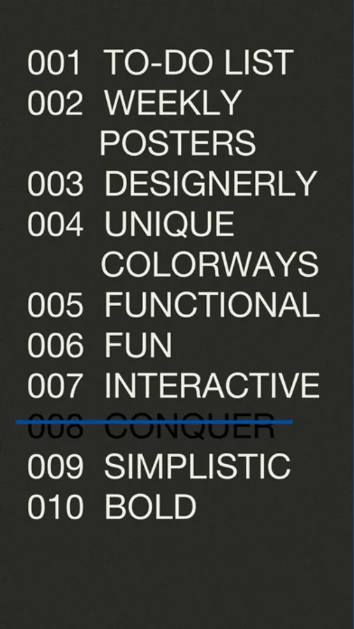 Conquer is a free daily to-do app. A simple one. The app helps you Conquer daily tasks. Maybe it will replace sticky notes, maybe it will help you enjoy checking stuff off your list, or maybe you downloaded it because it doesn’t look like every other app in the app store and you want to give it a test drive. Either way, we’re glad you’re here. So here’s how the app works.