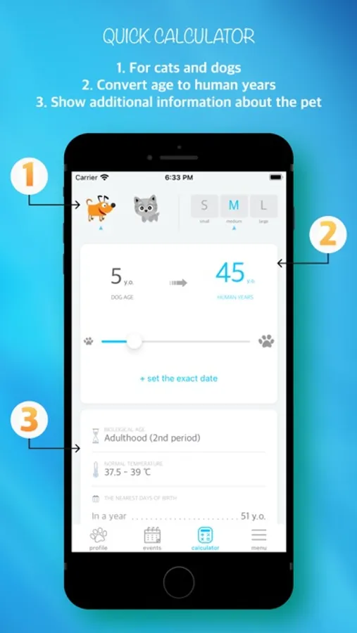 — convert cat or dog age to human years with a simple movement of your finger;