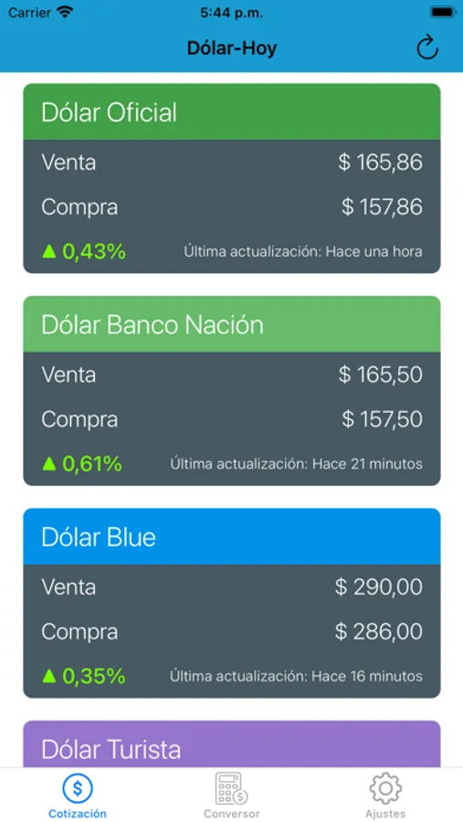 Dólar-Hoy te permite conocer en cualquier instante, de forma simple y gratuita, la cotización de los diferentes tipos de cambio que cotizan en Argentina.