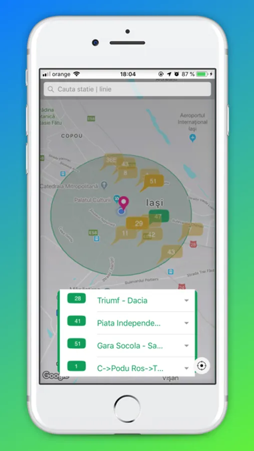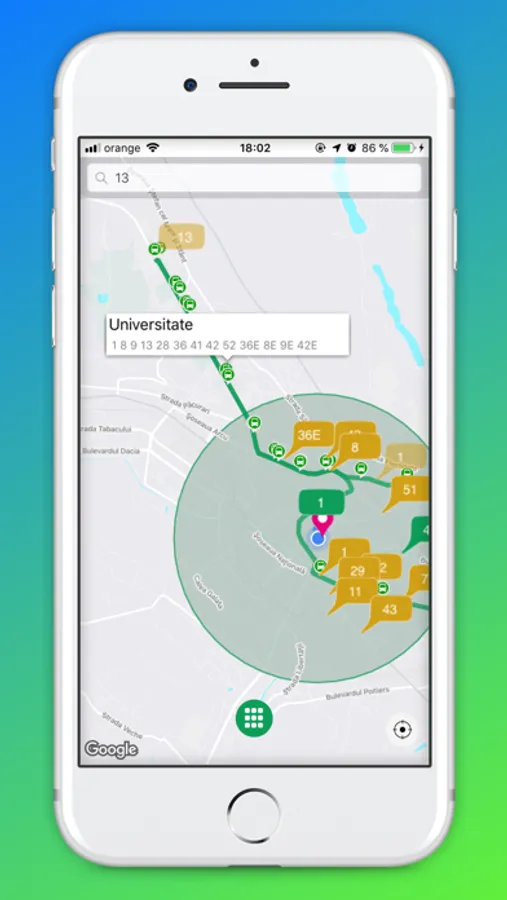 Practic incarcam pe harta doar mijloacele de transport in comun de pe o raza de un 1km fata de locatia mea curenta, desigur daca dorim sa vedem si dincolo de aceasta distanta putem folosi componenta de "Cautare", toate mijloacele de transport in comun selectate prin acea componenta devin vizibile pe harta necontand distanta fata de locatia mea. Putem defini un numar limitat momentan la 2 route "favorite", acestea vor fi vizibile pe harta pe toata suprafata orasului la incarcarea aplicatiei.
